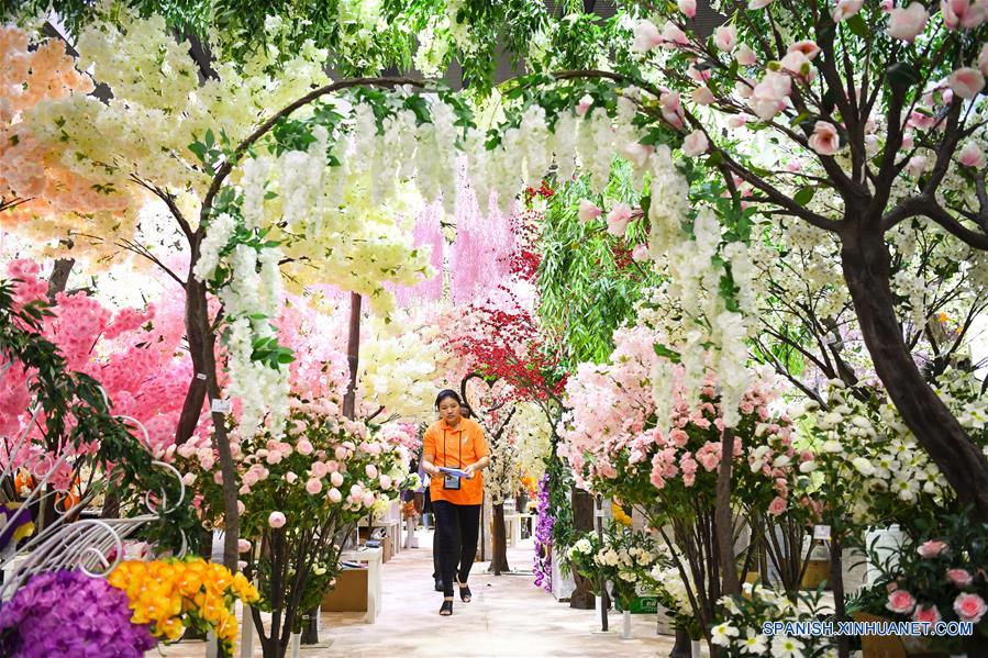 GUANGZHOU, octubre 23, 2018 (Xinhua) -- Decoraciones de flores artificiales son exhibidas durante la 124 Feria de la Importación y Exportación de China, también conocida como Feria de Cantón, en Guangzhou, capital de la provincia de Guangdong, en el sur de China, el 23 de octubre de 2018. La segunda etapa de la feria fue inaugurada el martes en Guangzhou. (Xinhua/Deng Hua)