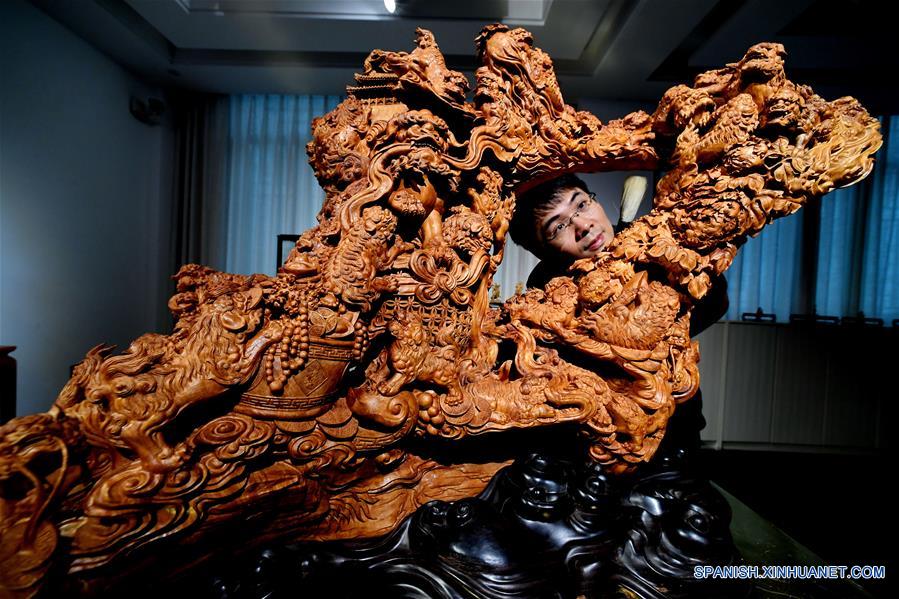 Imagen del 23 de octubre de 2018 del artesano Lin Jianjun, limpiando una pieza de tallado de madera en su estudio en Putian, en la provincia de Fujian, en el sureste de China. Lin Jianjun, quien aprendió tallado de madera a la edad de 16 a?os, ha estudiado la elaboración de su arte tradicional por más de 20 a?os. En 2014, Lin Jianjun se casó con Chen Qin, quien fue influenciada por su esposo y se interesó en el tallado de madera. Ella mejoró el tallado de madera al combinarlo con oro y plata. La pareja trata de promover el tallado de madera de Putian al dar lecciones, instruyendo a aprendices y mostrando sus obras al público. En 2018, Lin Jianjun fue designado como el heredero del tallado de madera, un patrimonio cultural intangible a nivel provincial. (Xinhua/Zhang Guojun)