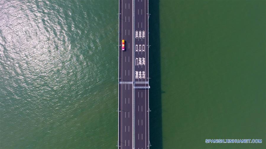 ZHUHAI, octubre 24, 2018 (Xinhua) -- Vista aérea de un autobús transitando sobre el puente Hong Kong-Zhuhai-Macao, el 24 de octubre de 2018. El puente Hong Kong-Zhuhai-Macao, el puente marítimo más largo del mundo, abrió oficialmente al tránsito a las 9:00 horas del 24 de octubre. (Xinhua/Liang Xu)