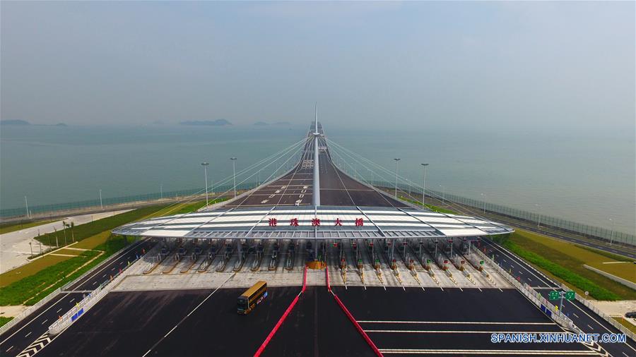 ZHUHAI, octubre 24, 2018 (Xinhua) -- Vista aérea de un autobús saliendo de una estación de peaje del puente Hong Kong-Zhuhai-Macao, el 24 de octubre de 2018. El puente Hong Kong-Zhuhai-Macao, el puente marítimo más largo del mundo, abrió oficialmente al tránsito a las 9:00 horas del 24 de octubre. (Xinhua/Liang Xu)