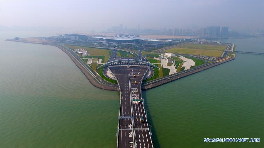 ZHUHAI, octubre 24, 2018 (Xinhua) -- Vista aérea de automóviles transitando sobre el puente Hong Kong-Zhuhai-Macao, el 24 de octubre de 2018. El puente Hong Kong-Zhuhai-Macao, el puente marítimo más largo del mundo, abrió oficialmente al tránsito a las 9:00 horas del 24 de octubre. (Xinhua/Liang Xu)