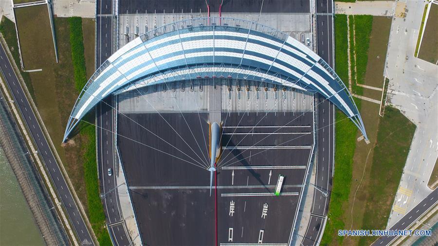 ZHUHAI, octubre 24, 2018 (Xinhua) -- Vista aérea de un autobús transitando sobre el puente Hong Kong-Zhuhai-Macao, el 24 de octubre de 2018. El puente Hong Kong-Zhuhai-Macao, el puente marítimo más largo del mundo, abrió oficialmente al tránsito a las 9:00 horas del 24 de octubre. (Xinhua/Liang Xu)