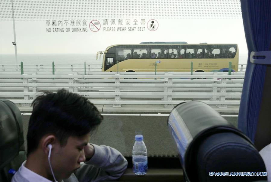 HONG KONG, octubre 24, 2018 (Xinhua) -- Automóviles transitan sobre el puente Hong Kong-Zhuhai-Macao, el 24 de octubre de 2018. El puente Hong Kong-Zhuhai-Macao, el puente marítimo más largo del mundo, abrió oficialmente al tránsito a las 9:00 horas del 24 de octubre. (Xinhua/Wang Shen)