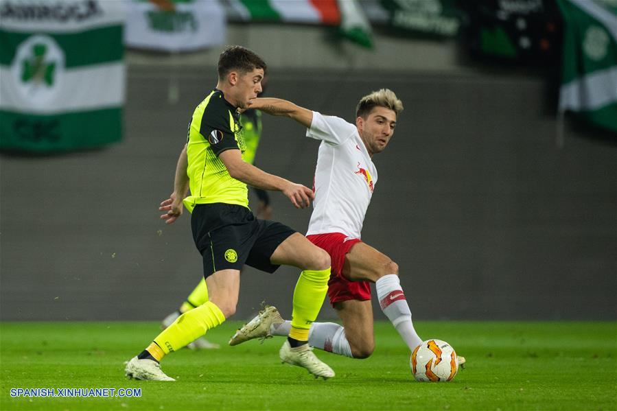 LEIPZIG, octubre 25, 2018 (Xinhua) -- Kevin Kampl (d), de Leipzig, disputa el balón con Ryan Christie (i), de Celtic, durante un partido del Grupo B de la Liga Europa de la Unión de Asociaciones de Fútbol Europeas (UEFA, por sus siglas en inglés), en Leipzig, Alemania, el 25 de octubre de 2018. (Xinhua/Kevin Voigt)