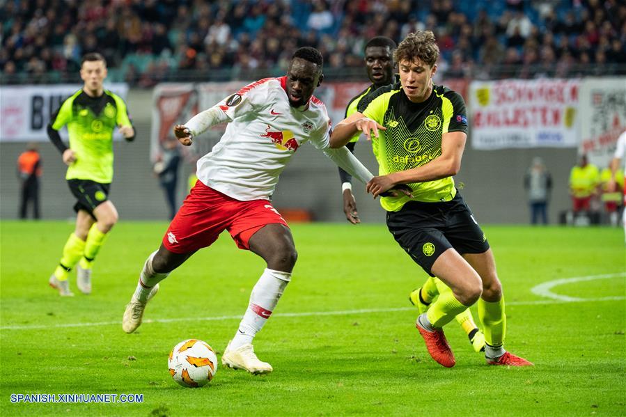 LEIPZIG, octubre 25, 2018 (Xinhua) -- Jean-Kevin Augustin (i), de Leipzig, disputa el balón con Jack Hendry (d), de Celtic, durante un partido del Grupo B de la Liga Europa de la Unión de Asociaciones de Fútbol Europeas (UEFA, por sus siglas en inglés), en Leipzig, Alemania, el 25 de octubre de 2018. (Xinhua/Kevin Voigt)