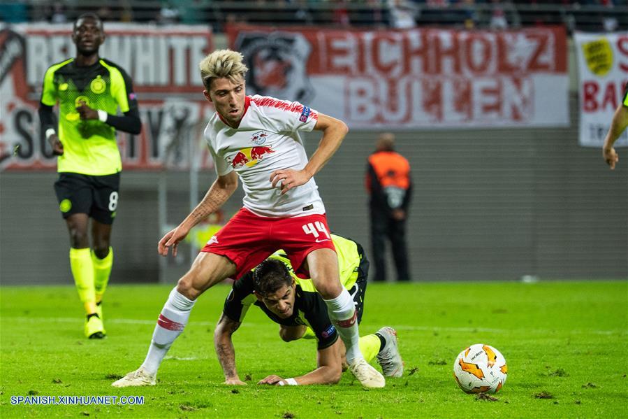 LEIPZIG, octubre 25, 2018 (Xinhua) -- Kevin Kampl (arriba), de Leipzig, disputa el balón con Cristian Gamboa (abajo), de Celtic, durante un partido del Grupo B de la Liga Europa de la Unión de Asociaciones de Fútbol Europeas (UEFA, por sus siglas en inglés), en Leipzig, Alemania, el 25 de octubre de 2018. (Xinhua/Kevin Voigt)