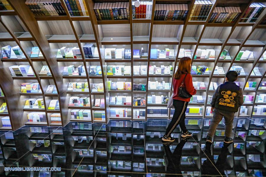 GUIZHOU, octubre 28, 2018 (Xinhua) -- Personas observan libros en una librería llamada Zhongshuge en el distrito Guanshanhu de Guiyang, provincia de Guizhou, en el suroeste de China, el 28 de octubre de 2018. El dise?o de la librería Zhongshuge está inspirado en el único relieve kárstico en Guizhou. (Xinhua/Liu Xu)