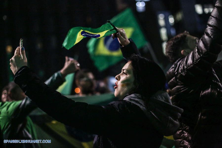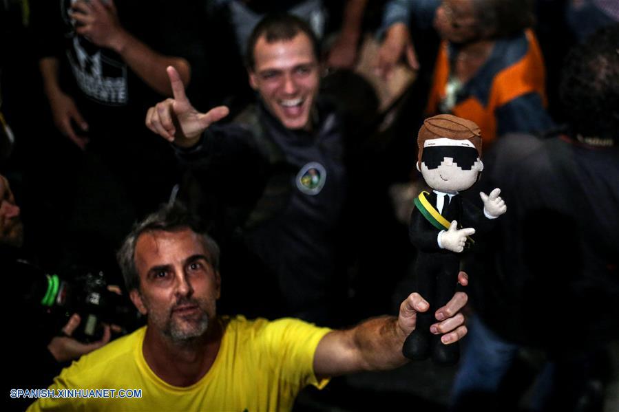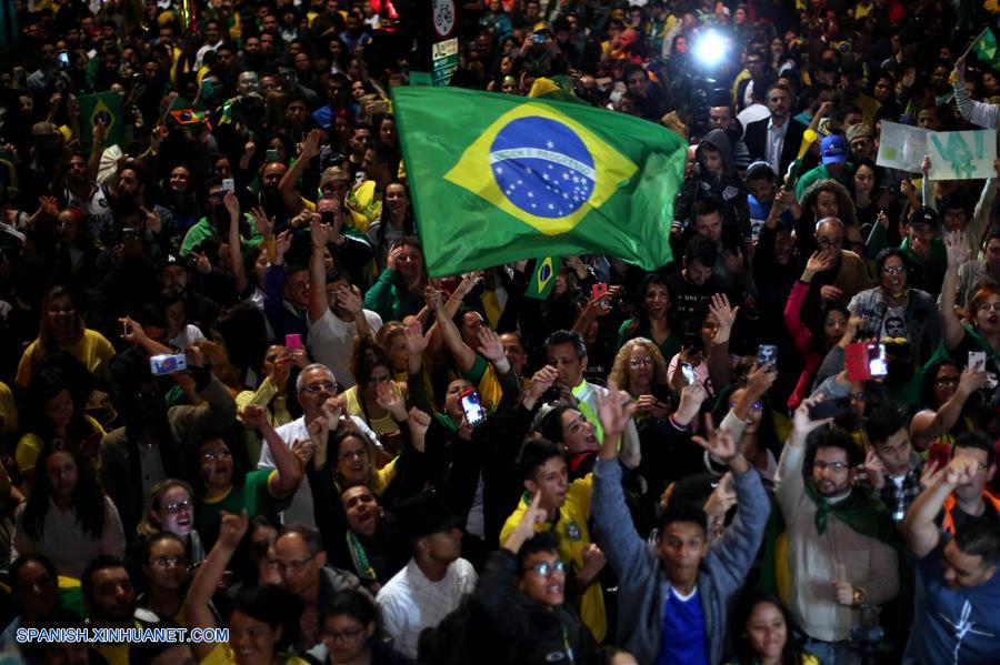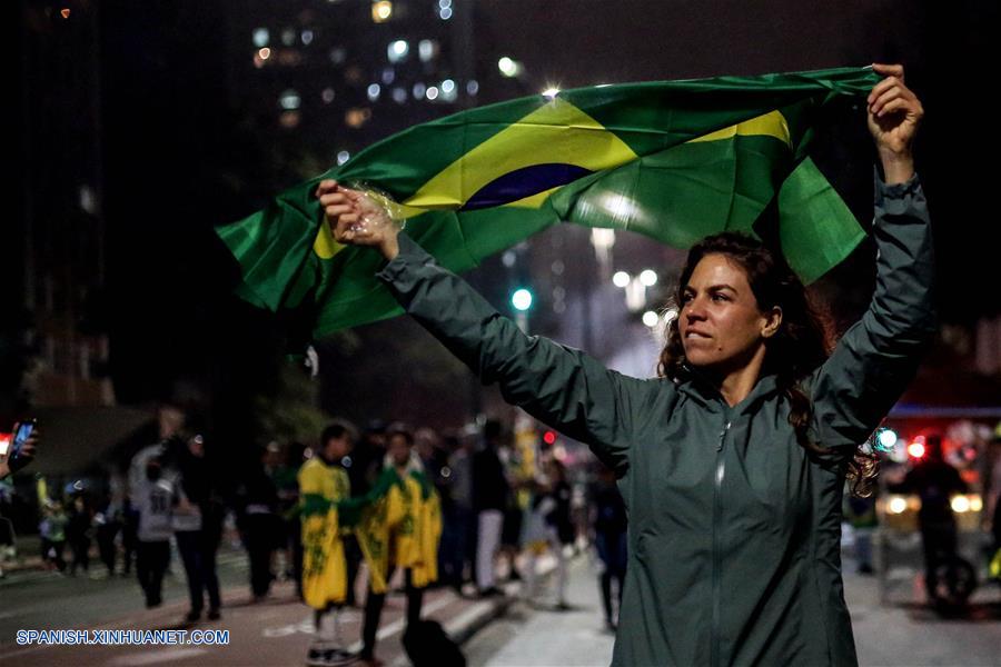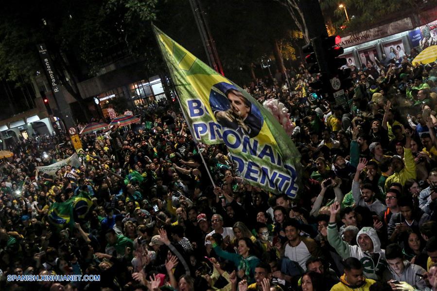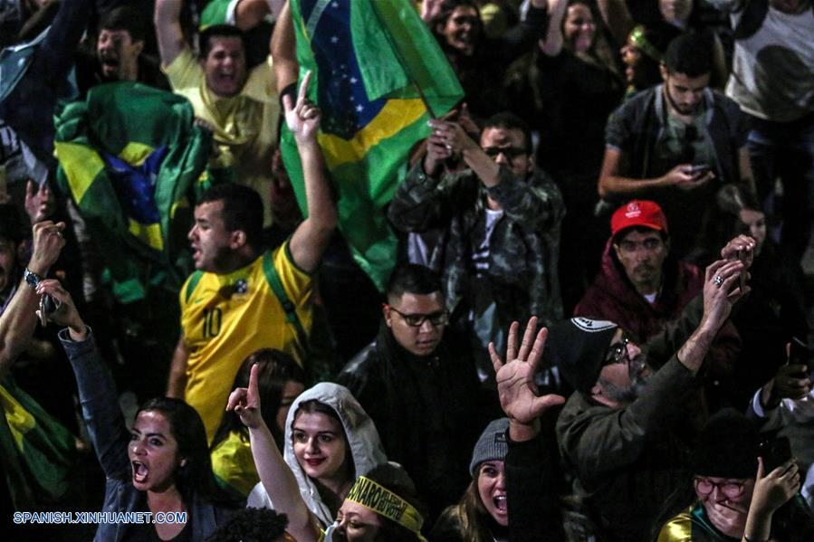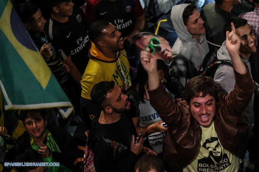 SAO PAULO, octubre 28, 2018 (Xinhua) -- Simpatizantes del presidente electo de Brasil, Jair Bolsonaro, reaccionan al conocer los resultados de las elecciones generales en Sao Paulo, Brasil, el 28 de octubre de 2018. La presidente del Tribunal Superior Electoral (TSE) de Brasil, Rosa Weber, anunció en la noche del domingo formalmente la victoria de Jair Bolsonaro, del Partido Social Liberal (PSL), en la segunda vuelta electoral, consagrado presidente electo del país sudamericano. (Xinhua/Rahel Patrasso)