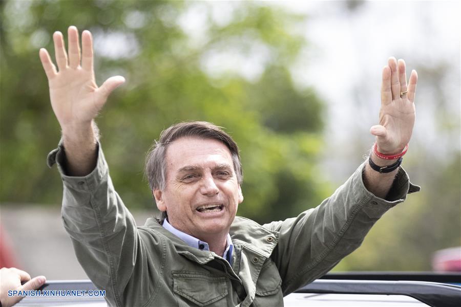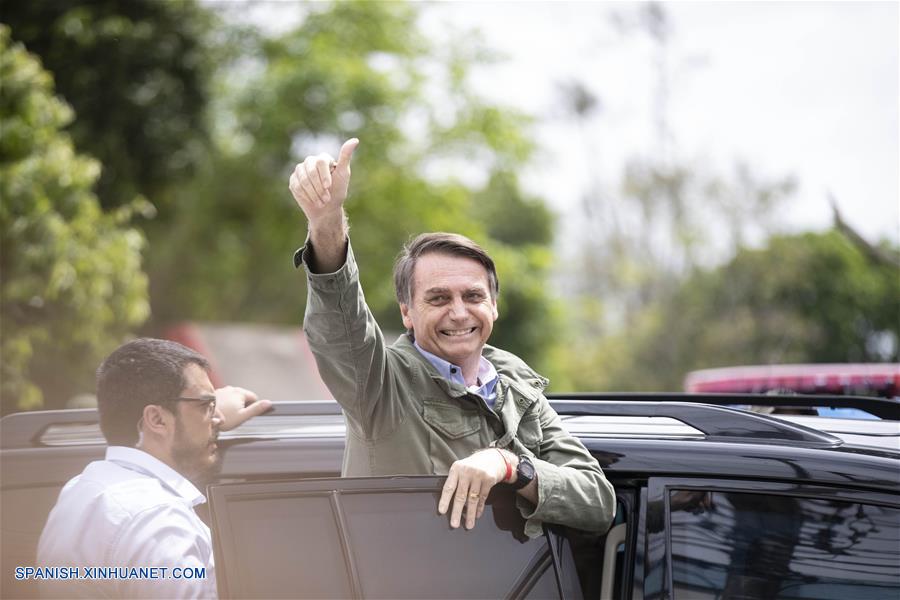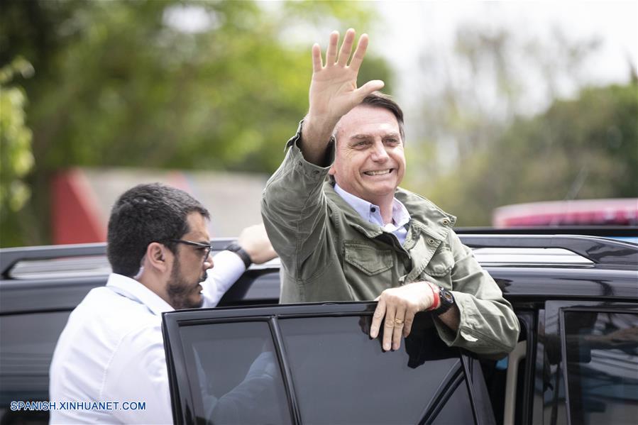 RIO DE JANEIRO, octubre 28, 2018 (Xinhua) -- El candidato del Partido Social Liberal (PSL) a la Presidencia de Brasil, Jair Bolsonaro (d), saluda luego de emitir su voto para la segunda vuelta de las elecciones generales, en Río de Janeiro, Brasil, el 28 de octubre de 2018. Los brasile?os acuden el domingo a votar en la segunda vuelta de las elecciones generales de Brasil, en medio de una fuerte división que refleja la profunda crisis económica y política de los últimos a?os, con un incremento de posiciones extremistas y episodios de violencia política. (Xinhua/Li Ming)