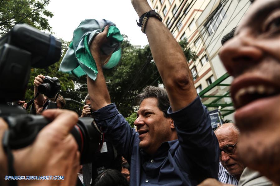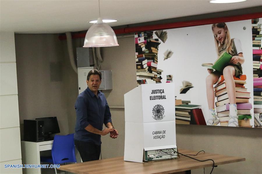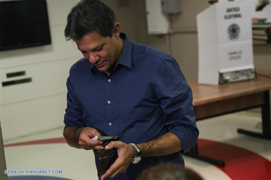 SAO PAULO, octubre 28, 2018 (Xinhua) -- El candidato presidencial por el Partido de los Trabajadores (PT), Fernando Haddad, acude a emitir su voto para la segunda vuelta de las elecciones generales en una casilla electoral, en Sao Paulo, Brasil, el 28 de octubre de 2018. Los colegios electorales abrieron las puertas el domingo en Brasil a las 8:00, hora de Brasilia (11:00 GMT), para la segunda vuelta de las elecciones generales, en las que se elegirán al presidente y vicepresidente del país para los próximos cuatro a?os. (Xinhua/Rahel Patrasso)