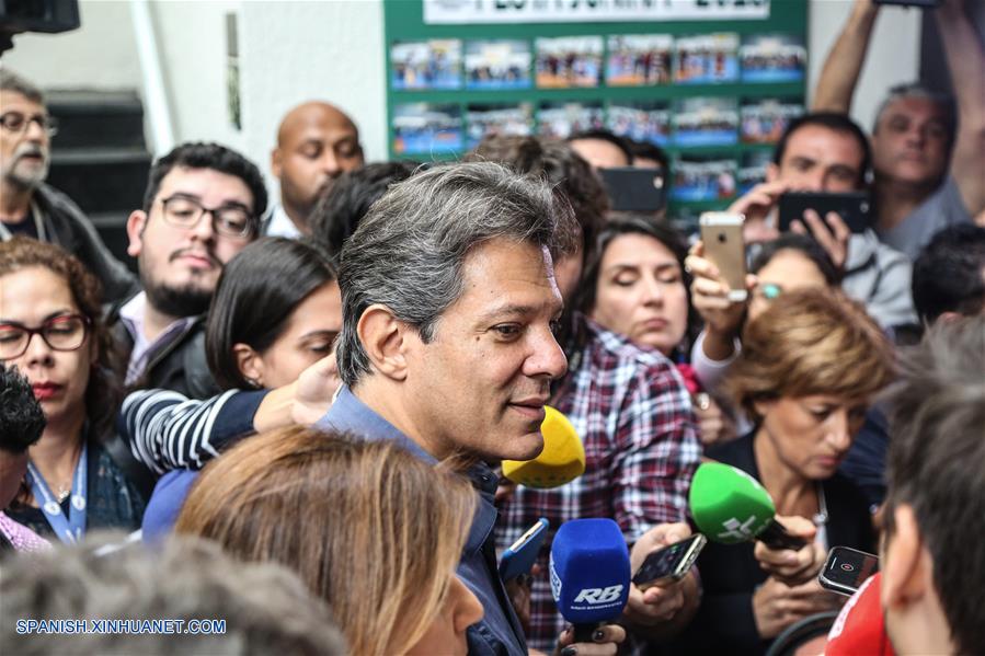 SAO PAULO, octubre 28, 2018 (Xinhua) -- El candidato presidencial por el Partido de los Trabajadores (PT), Fernando Haddad (c-frente), conversa con representantes de los medios de comunicación después de emitir su voto para la segunda vuelta de las elecciones generales en Sao Paulo, Brasil, el 28 de octubre de 2018. Los colegios electorales abrieron las puertas el domingo en Brasil a las 8:00, hora de Brasilia (11:00 GMT), para la segunda vuelta de las elecciones generales, en las que se elegirán al presidente y vicepresidente del país para los próximos cuatro a?os. (Xinhua/Rahel Patrasso)