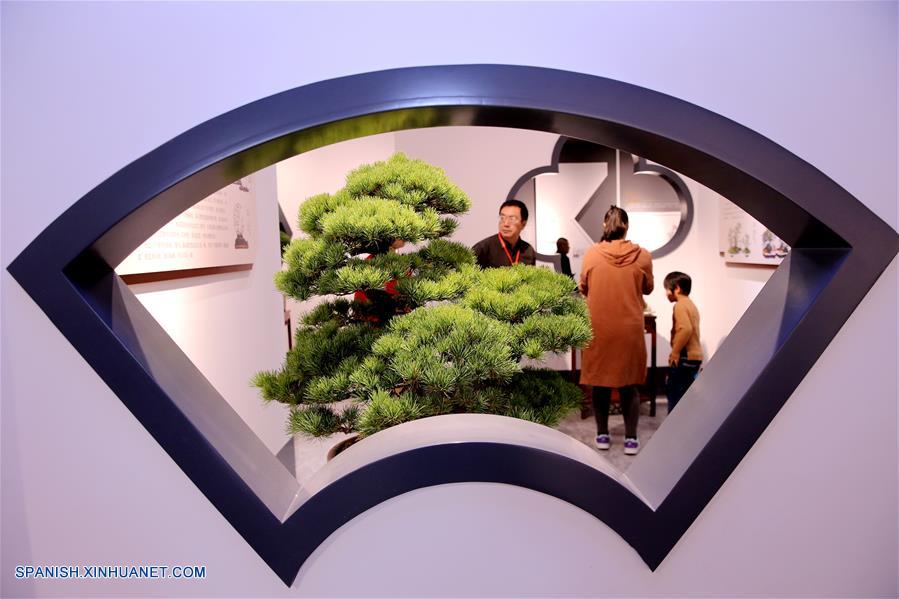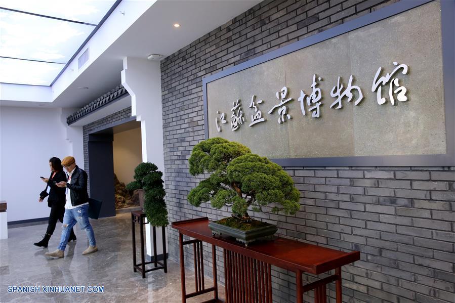 JIANGSU, octubre 28, 2018 (Xinhua) -- Visitantes salen de un museo de árboles bonsai en Rugao, provincia de Jiangsu, en el este de China, el 28 de octubre de 2018. (Xinhua/Xu Congjun)