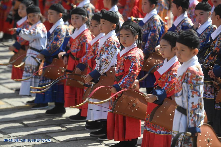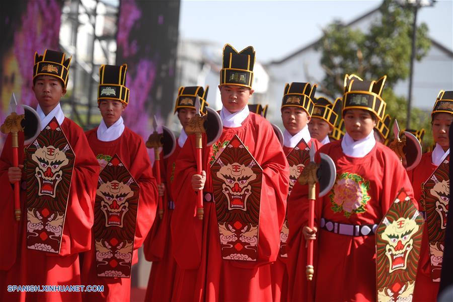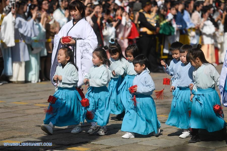 ZHEJIANG, octubre 29, 2018 (Xinhua) -- Imagen del 27 de octubre de 2018 de ni?os usando trajes tradicionales mientras asisten a una actividad durante una exposición de trajes tradicionales chinos, llevada a cabo en la antigua ciudad Xitang de Jiashan, en la provincia de Zhejiang, en el este de China. (Xinhua/Huang Zongzhi)