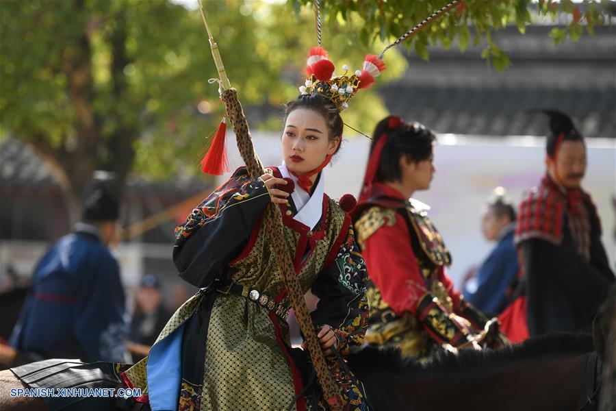 ZHEJIANG, octubre 29, 2018 (Xinhua) -- Imagen del 27 de octubre de 2018 de una mujer usando un traje tradicional mientras asiste a una actividad durante una exposición de trajes tradicionales chinos, llevada a cabo en la antigua ciudad Xitang de Jiashan, en la provincia de Zhejiang, en el este de China. (Xinhua/Huang Zongzhi)