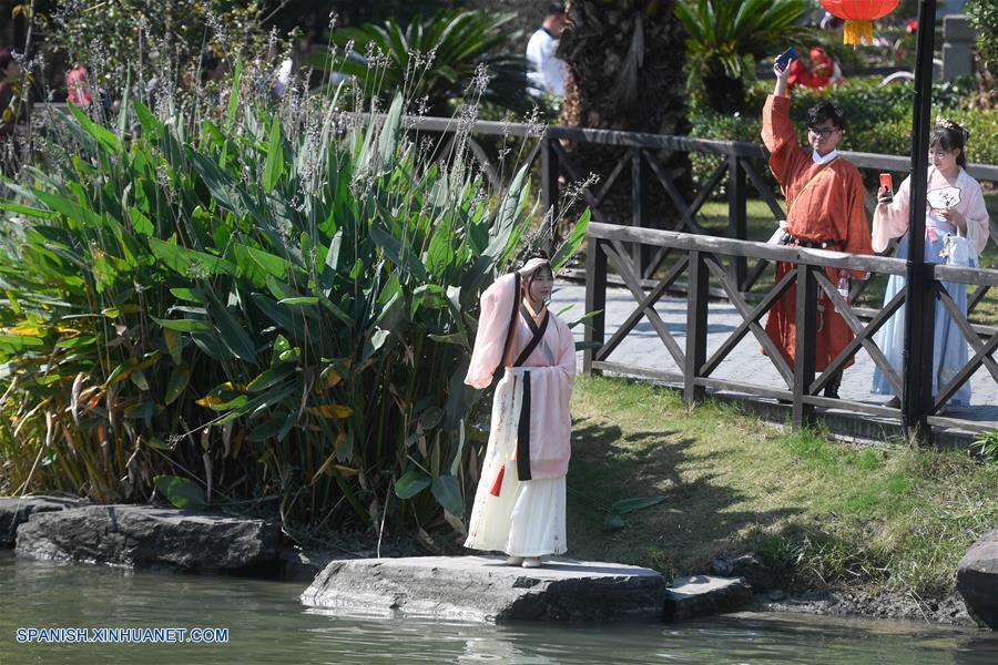 ZHEJIANG, octubre 29, 2018 (Xinhua) -- Imagen del 27 de octubre de 2018 de personas usando trajes tradicionales mientras asisten a una actividad durante una exposición de trajes tradicionales chinos, llevada a cabo en la antigua ciudad Xitang de Jiashan, en la provincia de Zhejiang, en el este de China. (Xinhua/Huang Zongzhi)