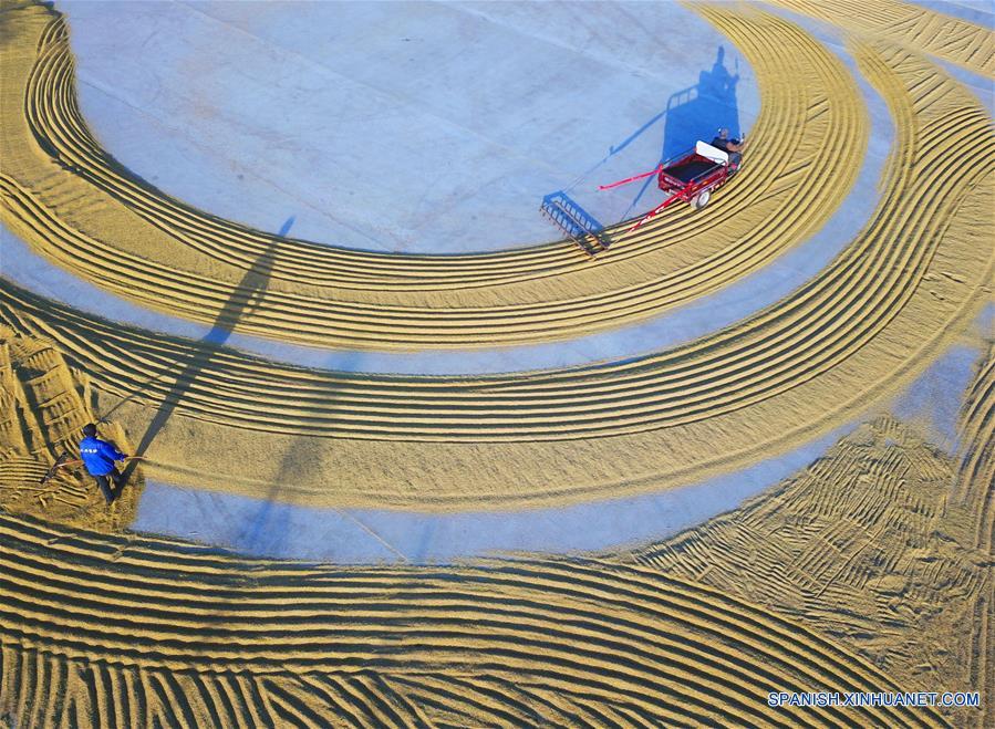 JIANGSU, octubre 29, 2018 (Xinhua) -- Vista aérea de un granjero arando arroz para secarlo al aire en la villa Qufang, del distrito de Ganyu, en la ciudad de Lianyungang, en la provincia de Jiangsu, en el este de China, el 29 de octubre de 2018. (Xinhua/Geng Yuhe) (rtg) (ah)