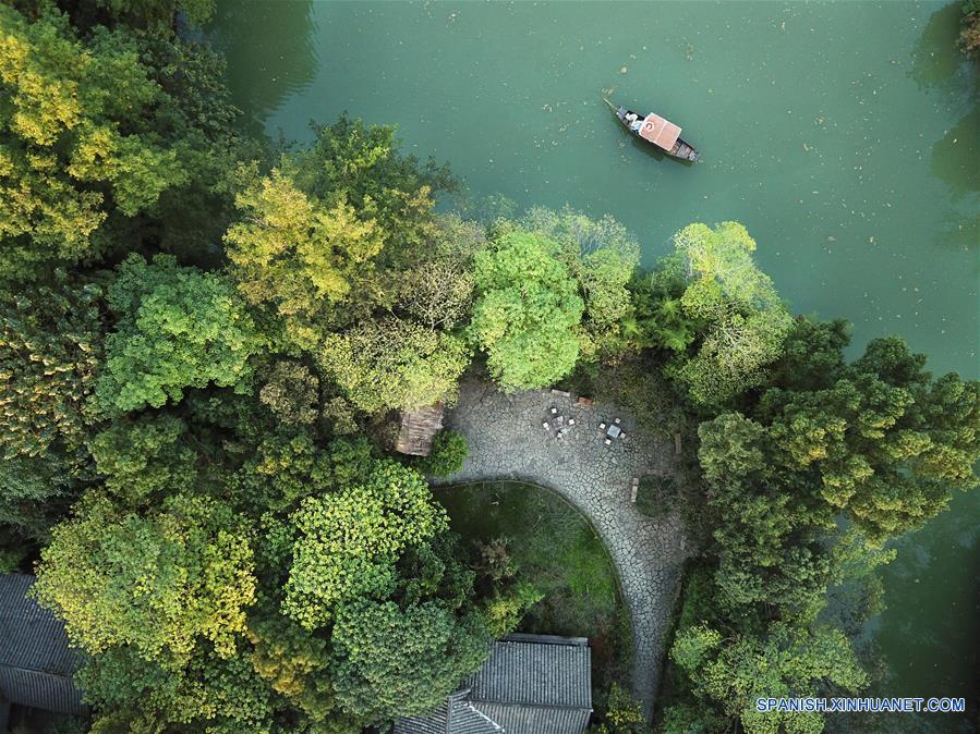 HANGZHOU, octubre 29, 2018 (Xinhua) -- Vista aérea de un barco navegando en el Parque Nacional del Humedal Xixi, en Hangzhou, en la provincia de Zhejiang, en el este de China, el 29 de octubre de 2018. (Xinhua/Weng Xinyang)
