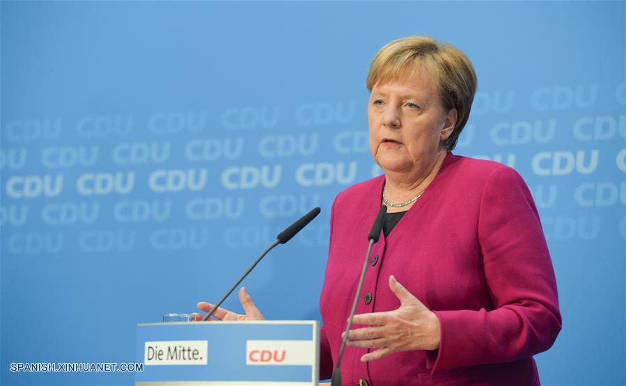 BERLIN, octubre 29, 2018 (Xinhua) -- La canciller alemana, Angela Merkel asiste a una conferencia de prensa en la sede de la Unión Cristianodemócrata (CDU), en Berlín, capital de Alemania, el 29 de octubre de 2018. La canciller de Alemania, Angela Merkel, dijo el lunes que no contenderá por un cuarto mandato como canciller en 2021, cuando concluye su mandato actual. (Xinhua/Lian zhen)