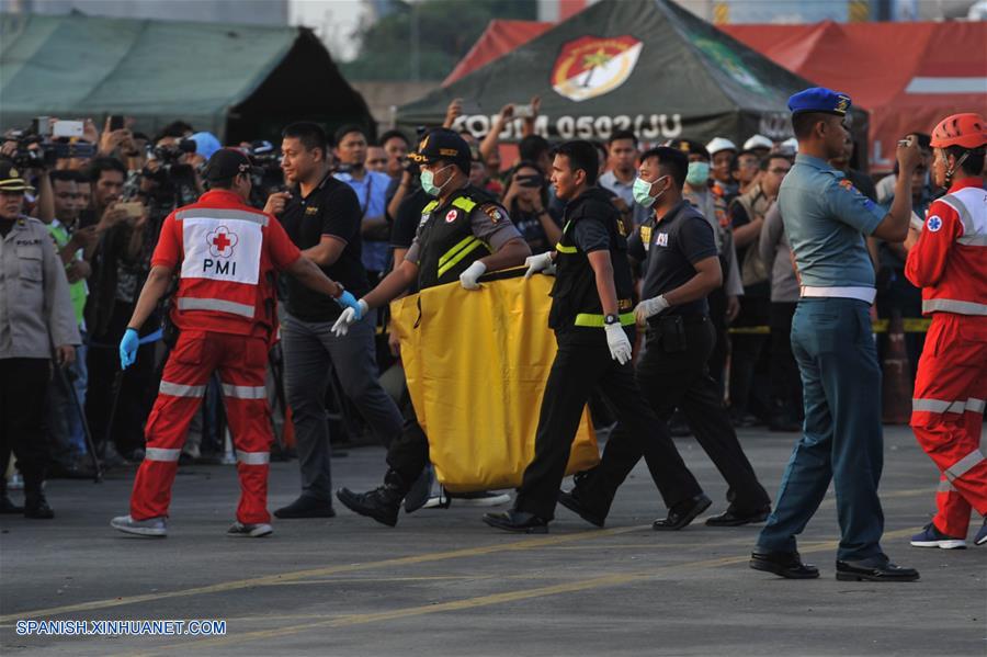 YAKARTA, octubre 29, 2018 (Xinhua) -- Oficiales de Búsqueda y Rescate cargan bolsas con los cuerpos de las víctimas del vuelo JT610 de Lion Air que se estrelló en el mar en Karawang, en la provincia de Java Occidental, en la base conjunta de Búsqueda y Rescate en el Puerto Tanjung Priok, en Yakarta, Indonesia, el 29 de octubre de 2018. La Oficina Nacional de Búsqueda y Rescate de Indonesia dijo el lunes que todas las 189 personas a bordo de un avión de la Lion Air que se estrelló en el mar frente al oeste de Indonesia habrían muerto. (Xinhua/Veri Sanovri)