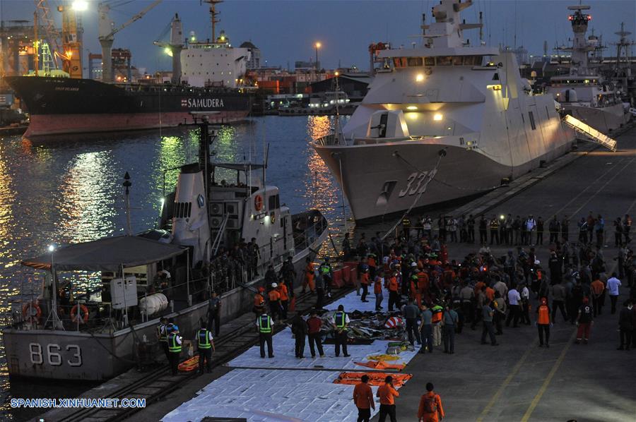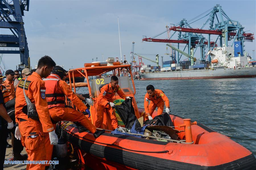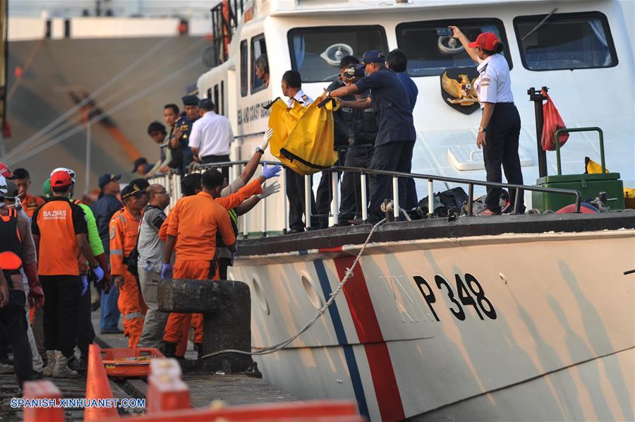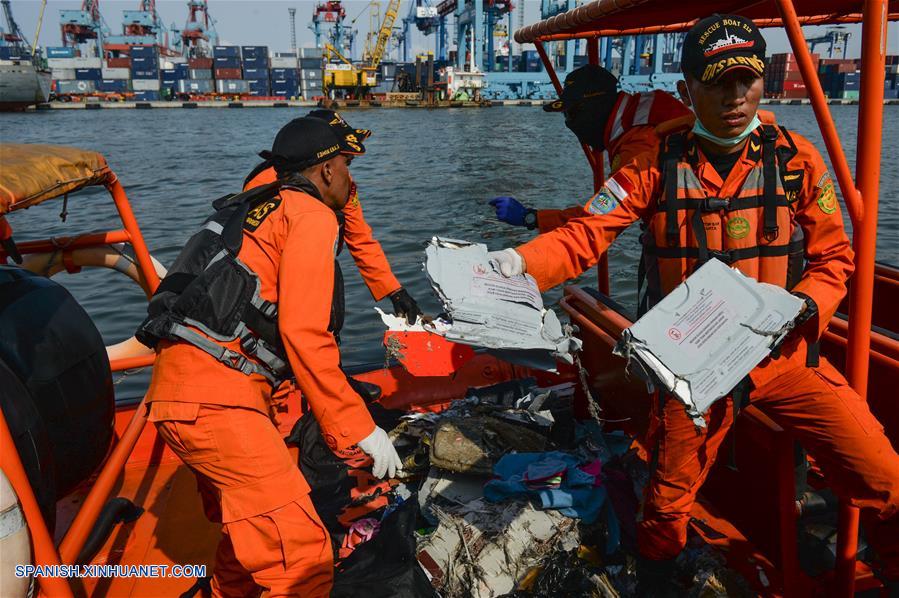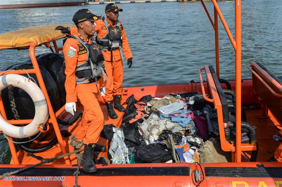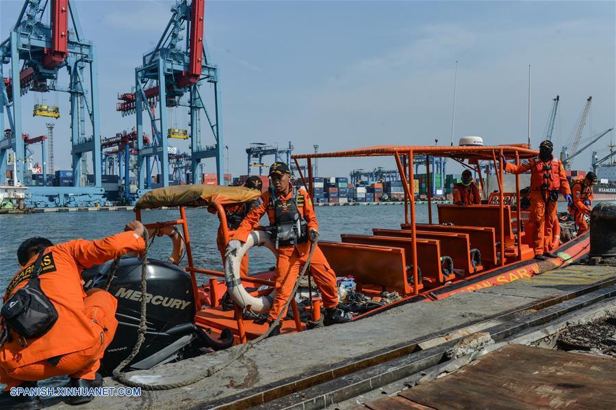 YAKARTA, octubre 29, 2018 (Xinhua) -- Oficiales de Búsqueda y Rescate permanecen en el bote que transporta escombros del avión y cuerpos de las víctimas del vuelo JT610 de Lion Air que se estrelló en el mar en Karawang, en la provincia de Java Occidental, mientras llegan a la base conjunta de Búsqueda y Rescate en el Puerto Tanjung Priok, en Yakarta, Indonesia, el 29 de octubre de 2018. La Oficina Nacional de Búsqueda y Rescate de Indonesia dijo el lunes que todas las 189 personas a bordo de un avión de la Lion Air que se estrelló en el mar frente al oeste de Indonesia habrían muerto. (Xinhua/Veri Sanovri)