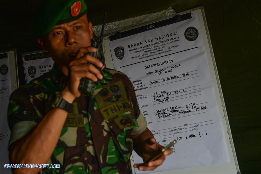 YAKARTA, octubre 29, 2018 (Xinhua) -- Un soldado reacciona frente a un tablero de información de búsqueda en la base conjunta de Búsqueda y Rescate en el Puerto Tanjung Priok, en Yakarta, Indonesia, el 29 de octubre de 2018. La Oficina Nacional de Búsqueda y Rescate de Indonesia dijo el lunes que todas las 189 personas a bordo de un avión de la Lion Air que se estrelló en el mar frente al oeste de Indonesia habrían muerto. (Xinhua/Veri Sanovri)