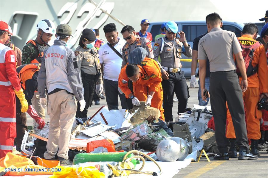 YAKARTA, octubre 29, 2018 (Xinhua) -- Oficiales de Búsqueda y Rescate recolectan escombros y pertenencias de los pasajeros del vuelo JT610 de Lion Air que se estrelló en el mar en Karawang, en la provincia de Java Occidental, en la base conjunta de Búsqueda y Rescate en el Puerto Tanjung Priok, en Yakarta, Indonesia, el 29 de octubre de 2018. La Oficina Nacional de Búsqueda y Rescate de Indonesia dijo el lunes que todas las 189 personas a bordo de un avión de la Lion Air que se estrelló en el mar frente al oeste de Indonesia habrían muerto. (Xinhua/Veri Sanovri)