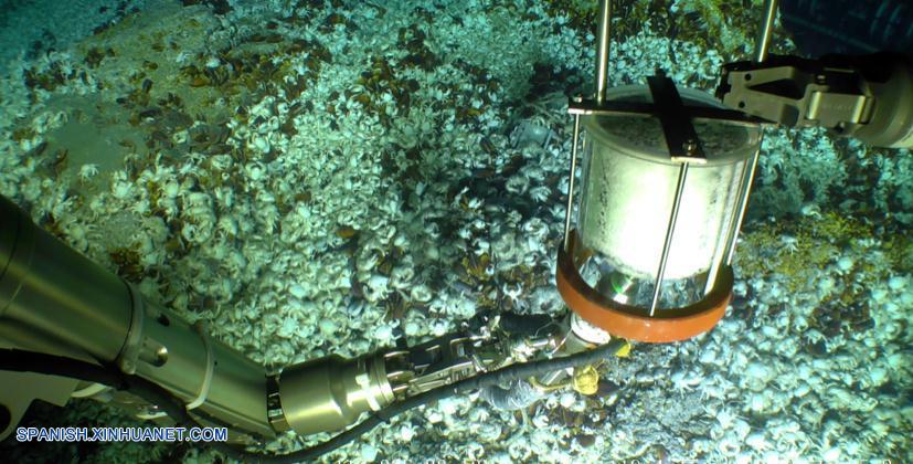 SHENYANG, octubre 29, 2018 (Xinhua) -- Imagen del 23 de octubre de 2018 de Haixing 6000, uno de los robots submarinos de China, recolectando muestras de agua y tierra durante una expedición de investigación. El Haixing 6000, estableció recientemente un récord nacional de profundidad para un vehículo chino operado a control remoto, al sumergirse 6,001 metros debajo de la superficie marina durante su primera expedición de investigación, dijeron el domingo científicos a Xinhua. El Haixing 6000 fue desarrollado por un equipo del Instituto de Automatización de Shenyang, subordinado a la Academia de Ciencias de China. Este es el primer vehículo submarino operado a control remoto por China que es capaz de sumergirse 6,000 metros, dijo Li Zhigang, científico en jefe del equipo. El vehículo alcanzó una profundidad máxima de 6.001 metros y completó una serie de tareas submarinas en tres horas, incluida observación en las profundidades del mar, investigación científica, recolección de muestras del suelo y agua y una búsqueda simulada de una caja negra. (Xinhua/Str)