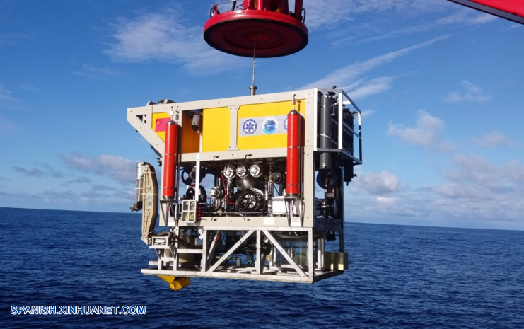 SHENYANG, octubre 29, 2018 (Xinhua) -- Imagen del 9 de octubre de 2018 de Haixing 6000, uno de los robots submarinos de China, durante una expedición de investigación. El Haixing 6000, estableció recientemente un récord nacional de profundidad para un vehículo chino operado a control remoto, al sumergirse 6,001 metros debajo de la superficie marina durante su primera expedición de investigación, dijeron el domingo científicos a Xinhua. El Haixing 6000 fue desarrollado por un equipo del Instituto de Automatización de Shenyang, subordinado a la Academia de Ciencias de China. Este es el primer vehículo submarino operado a control remoto por China que es capaz de sumergirse 6,000 metros, dijo Li Zhigang, científico en jefe del equipo. El vehículo alcanzó una profundidad máxima de 6.001 metros y completó una serie de tareas submarinas en tres horas, incluida observación en las profundidades del mar, investigación científica, recolección de muestras del suelo y agua y una búsqueda simulada de una caja negra. (Xinhua/Str)