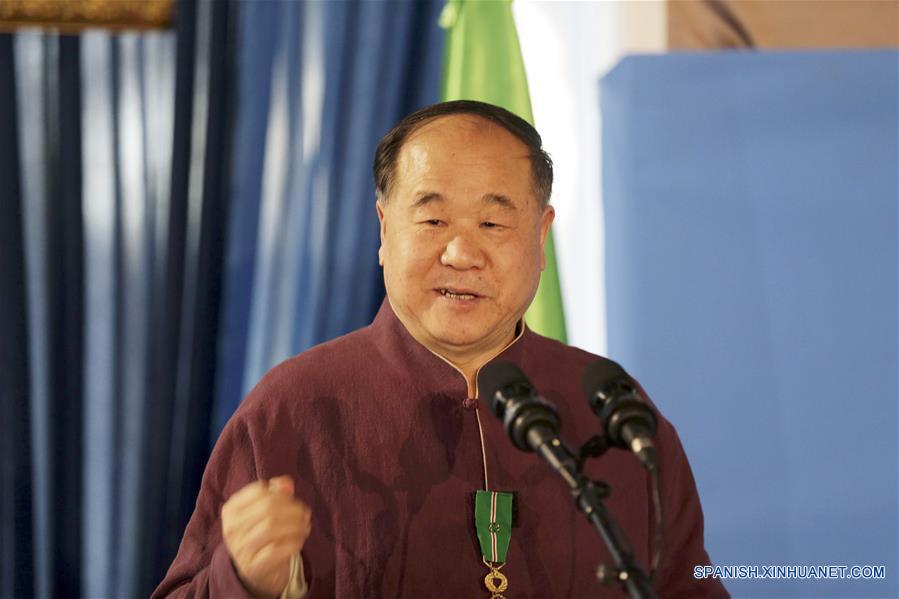 ARGEL, octubre 29, 2018 (Xinhua) -- El escritor chino Mo Yan, ganador del Premio Nobel de Literatura, pronuncia un discurso durante una ceremonia de premiación, en Argel, Argelia, el 29 de octubre de 2018. Argelia otorgó el lunes al escritor chino Mo Yan, ganador del Premio Nobel, la Medalla El Athir de la Orden del Mérito Nacional para homenajearlo a él y a la cultura china. (Xinhua/Str)