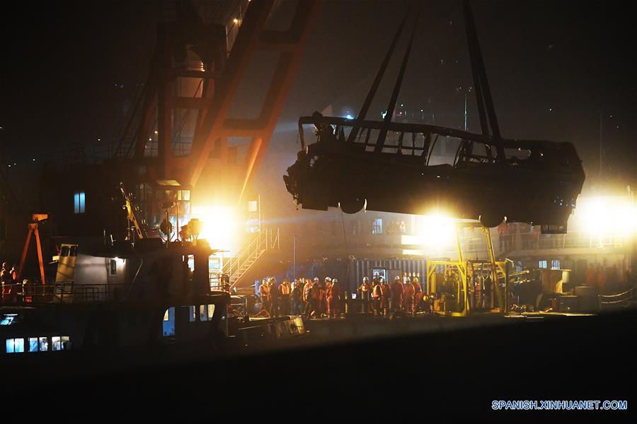 Rescatistas recuperan un autobús que cayó al río Yangtze en Wanzhou, en la municipalidad de Chongqing, en el suroeste de China, el 31 de octubre de 2018. El autobús fue sacado del agua con una grúa flotante alrededor de las 23:30 horas. Se espera que los socorristas entren al autobús en busca de más cuerpos de víctimas. El domingo, el autobús tomó el carril equivocado en la carretera y chocó de frente contra otro vehículo antes de romper la barra de contención lateral y caer desde un puente hacia el río en el distrito Wanzhou de Chongqing. Una investigación preliminar se?aló que 15 personas, incluido el conductor, estaban a bordo del autobús cuando ocurrió el accidente. Hasta el momento, han sido recuperados nueve cuerpos. (Xinhua/Wang Quanchao)