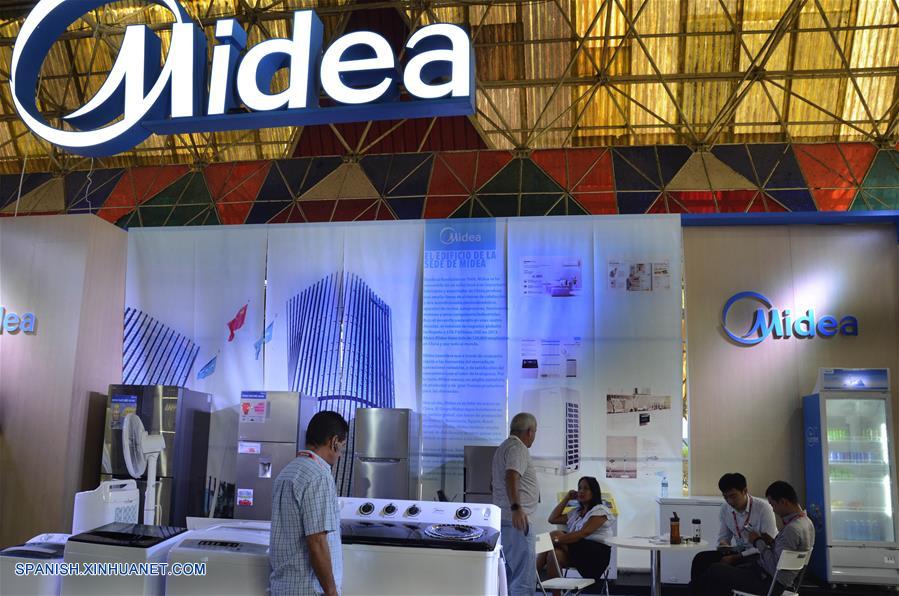 LA HABANA, noviembre 2, 2018 (Xinhua) -- Imagen del 30 de octubre de 2018, de personas visitando el estand de la marca Midea en el pabellón de China en la XXXVI Feria Internacional de La Habana (FIHAV 2018), en La Habana, Cuba. El ardiente sol caribe?o se mantiene en Cuba prácticamente todo el a?o, por eso no es de extra?ar que evadir la agobiante sensación de calor sea casi una obsesión para los cubanos, que en ese empe?o diario tienen un buen aliado en la compa?ía china Midea. Es por eso que resulta común hallar en cualquier hogar cubano un ventilador o un aire acondicionado de los que comercializa en la isla esa marca, con oficina en La Habana desde hace cinco a?os. La empresa ha logrado un buen posicionamiento en el mercado cubano, donde además ofrece lavadoras y refrigeradores con muy buena aceptación entre los compradores, por la excelente relación entre precio y calidad. Ahora mantiene un lazo muy estrecho con entidades importadoras y comercializadoras cubanas, como las empresas estatales ITH, CIMEX, Copextel y Cuba Electrónica, entre otras, lo que garantiza su permanencia en el país. (Xinhua/Joaquín Hernández)