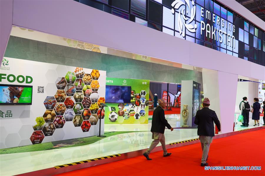 Personas caminan frente al pabellón de Pakistán durante la primera Exposición Internacional de Importaciones de China (CIIE) en Shanghai, en el este de China, el 5 de noviembre de 2018. Un total de 82 países y tres organizaciones internacionales presentarán sus avances en el desarrollo económico y comercial así como productos competitivos en 71 pabellones que ocupan un área de casi 30.000 metros cuadrados. (Xinhua/Liu Dawei)