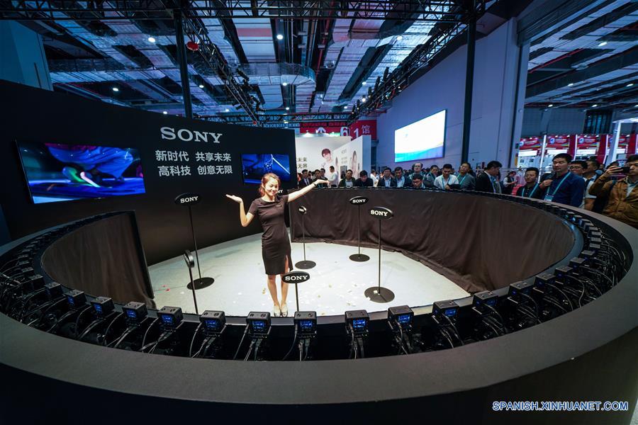 Una mujer experimenta el disparo por el efecto "tiempo de bala" en el estand de Sony durante la primera Exposición Internacional de Importaciones de China (CIIE) en Shanghai, en el este China, el 6 de noviembre de 2018. La primera CIIE se lleva a cabo del 5 al 10 de noviembre en Shanghai. (Xinhua/Wang Jianhua)