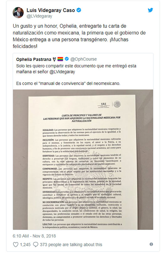 “Un gusto y un honor, Ophelia, entregarte tu carta de naturalización como mexicana, la primera que el gobierno de México entrega a una persona transgénero. ?Muchas felicidades! https://t.co/Z7ZwWIYQZT— Luis Videgaray Caso (@LVidegaray) November 7, 2018.”