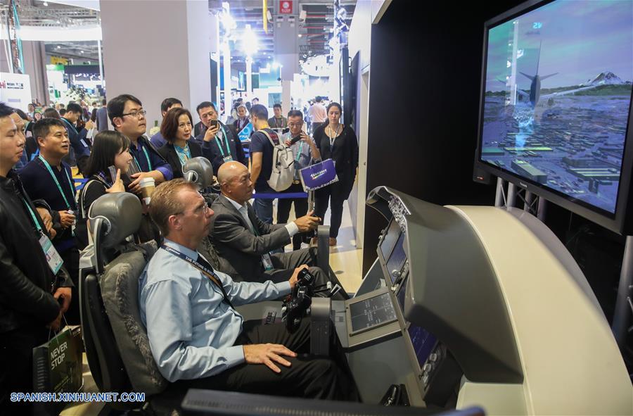 SHANGHAI, noviembre 6, 2018 (Xinhua) -- Un visitante prueba un simulador de vuelo Boeing, durante la primera Exposición Internacional de Importaciones de China (CIIE), en Shanghai, en el este China, el 6 de noviembre de 2018. El área de exhibición de Equipamiento Inteligente de Alta Gama en la CIIE cubre inteligencia artificial, automatización y robotización industrial, fábricas digitales, energía nueva, equipamiento eléctrico y energético, tecnologías y equipamiento aeroespacial y de aviación, atrayendo a muchos visitantes. (Xinhua/Ding Ting)