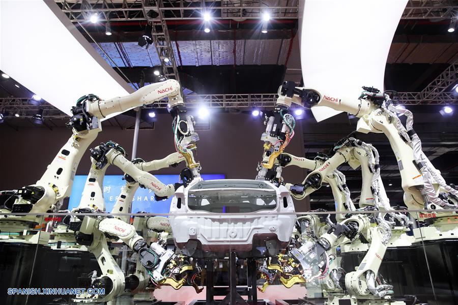 SHANGHAI, noviembre 6, 2018 (Xinhua) -- Brazos robóticos de la compa?ía japonesa Nachi-Fujikoshi Corp. simulan el armado de un automóvil durante la primera Exposición Internacional de Importaciones de China (CIIE), en Shanghai, en el este China, el 6 de noviembre de 2018. El área de exhibición de Equipamiento Inteligente de Alta Gama en la CIIE cubre inteligencia artificial, automatización y robotización industrial, fábricas digitales, energía nueva, equipamiento eléctrico y energético, tecnologías y equipamiento aeroespacial y de aviación, atrayendo a muchos visitantes. (Xinhua/Ding Ting)