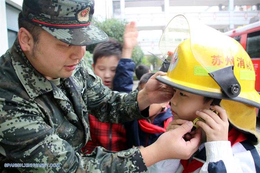JIANGSU, noviembre 8, 2018 (Xinhua) -- Un bombero muestra a un estudiante a usar un casco de bomberos, en Suzhou, provincia de Jiangsu, en el este de China, el 8 de noviembre de 2018. Campa?as de concienciación sobre seguridad contra incendios han sido llevadas a cabo alrededor de China en la jornada previa al Día Nacional de la Prevención de Incendios el 9 de noviembre. (Xinhua/Wang Jiankang)
