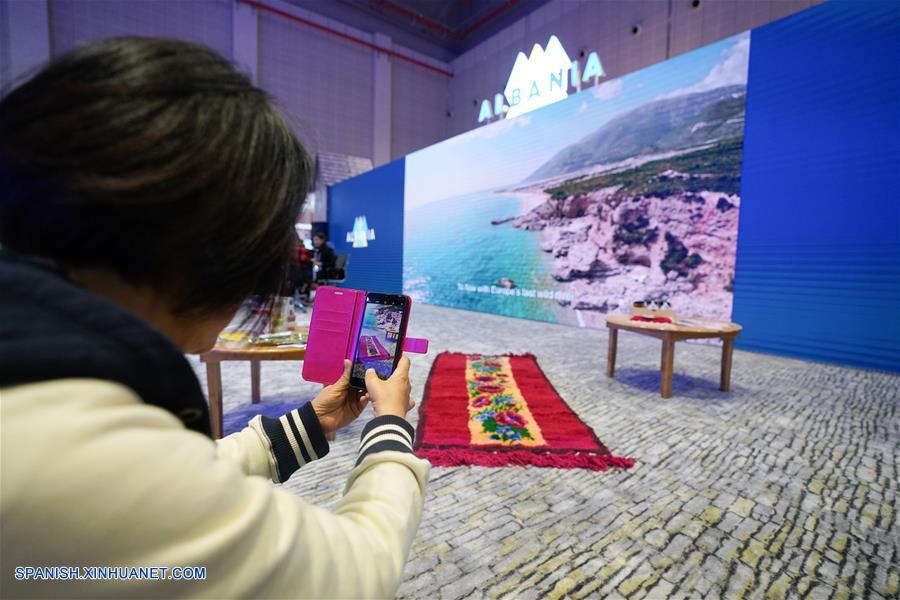 SHANGHAI, noviembre 8, 2018 (Xinhua) -- Imagen del 7 de noviembre de 2018 de una visitante tomando una fotografía de una alfombra en el estand de Albania de la primera Exposición Internacional de Importaciones de China (CIIE) en Shanghai, en el este de China. Un total de 82 países y tres organizaciones internacionales mostraron sus logros en el desarrollo económico y comercial así como sus productos competitivos en 71 estands en el Pabellón de País para el Comercio y la Inversión en la CIIE. (Xinhua/Wang Tiancong)