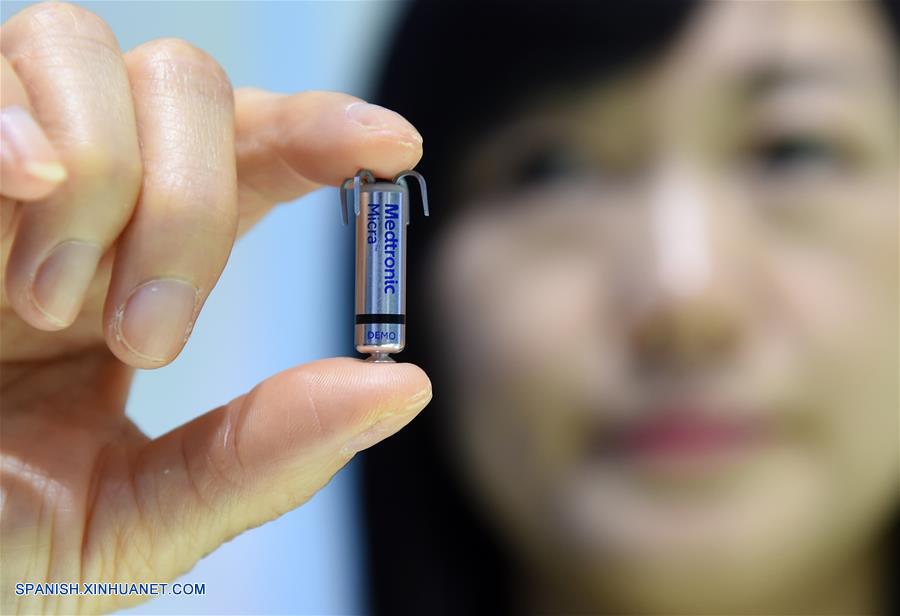 SHANGHAI, noviembre 8, 2018 (Xinhua) -- Una empleada presenta un marcapasos cardíaco en el estand de Medtronic, Inc. en el área de Productos de Equipo Médico y Cuidado de la Salud de la primera Exposición Internacional de Importaciones de China (CIIE) en Shanghai, en el este de China, el 8 de noviembre de 2018. (Xinhua/Han Yuqing)