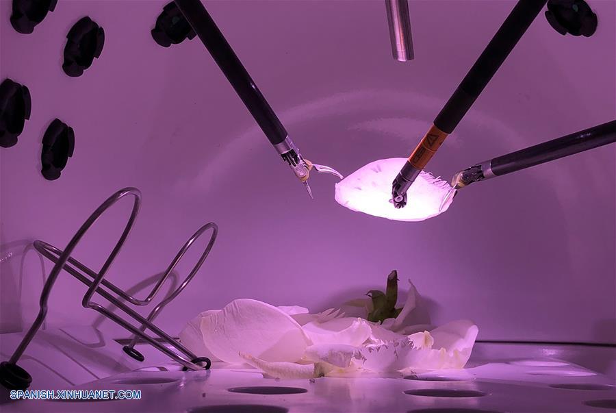 SHANGHAI, noviembre 8, 2018 (Xinhua) -- Pétalos de flor son cortados por el Sistema Quirúrgico da Vinci Xi durante una demostración en el área de Productos de Equipo Médico y Cuidado de la Salud de la primera Exposición Internacional de Importaciones de China (CIIE) en Shanghai, en el este de China, el 8 de noviembre de 2018. (Xinhua/Han Yuqing)