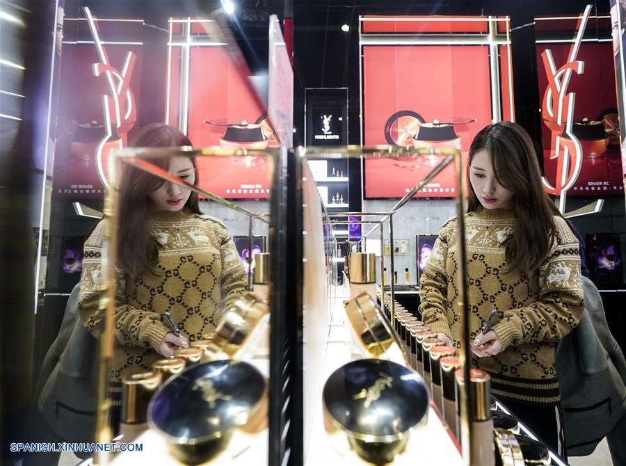SHANGHAI, noviembre 9, 2018 (Xinhua) -- Una visitante observa lápices labiales en el área de Ropa, Accesorios y Bienes de Consumo de la primera Exposición Internacional de Importaciones de China (CIIE), en Shanghai, en el este de China, el 9 de noviembre de 2018. (Xinhua/Shen Bohan)