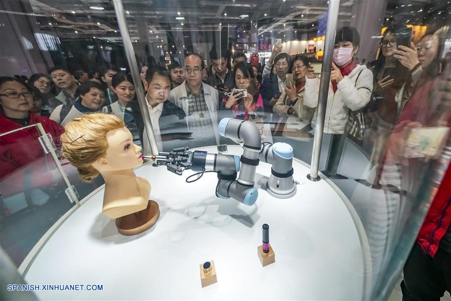 SHANGHAI, noviembre 9, 2018 (Xinhua) -- Visitantes observan un brazo robótico realizando un tutorial de maquillaje en el área de Ropa, Accesorios y Bienes de Consumo de la primera Exposición Internacional de Importaciones de China (CIIE), en Shanghai, en el este de China, el 9 de noviembre de 2018. (Xinhua/Shen Bohan)