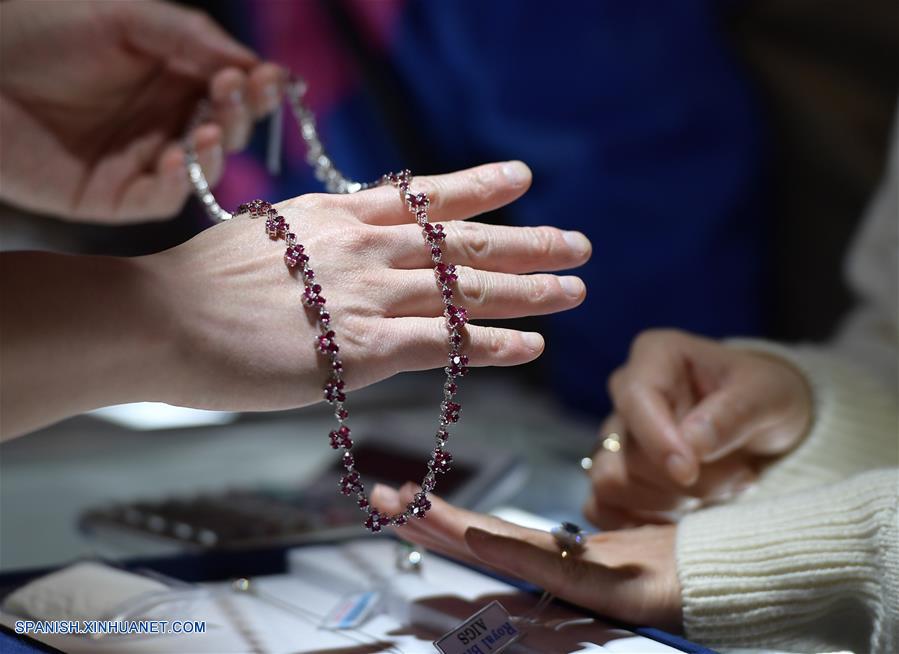 SHANGHAI, noviembre 9, 2018 (Xinhua) -- Una expositora muestra un collar de joyería en el área de Ropa, Accesorios y Bienes de Consumo de la primera Exposición Internacional de Importaciones de China (CIIE), en Shanghai, en el este de China, el 9 de noviembre de 2018. (Xinhua/Li He)