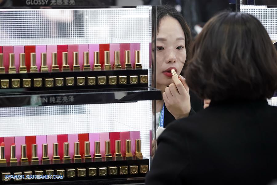 SHANGHAI, noviembre 9, 2018 (Xinhua) -- Una visitante prueba un lápiz labial en el área de Ropa, Accesorios y Bienes de Consumo de la primera Exposición Internacional de Importaciones de China (CIIE), en Shanghai, en el este de China, el 9 de noviembre de 2018. (Xinhua/Shen Bohan)