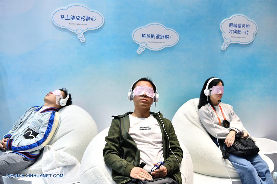 SHANGHAI, noviembre 9, 2018 (Xinhua) -- Visitantes prueban máscaras de vapor para ojos en el área de Ropa, Accesorios y Bienes de Consumo de la primera Exposición Internacional de Importaciones de China (CIIE), en Shanghai, en el este de China, el 9 de noviembre de 2018. (Xinhua/Li He)