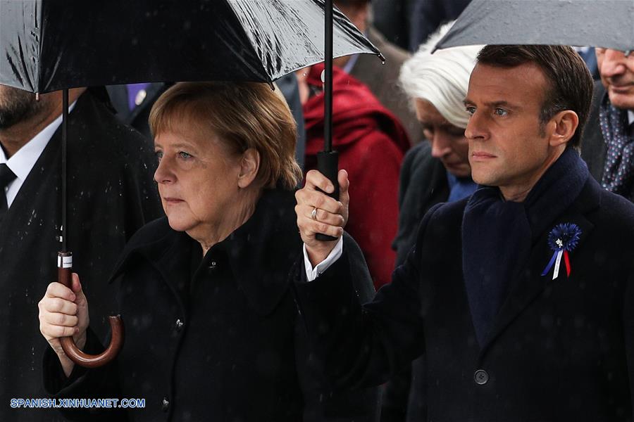 PARIS, noviembre 11, 2018 (Xinhua) -- El presidente francés Emmanuel Macron y la canciller alemana, Angela Merkel caminan en la ceremonia para conmemorar el centenario del fin de la Primera Guerra Mundial, en París, Francia, el 11 de noviembre de 2018. (Xinhua/Zheng Huansong)