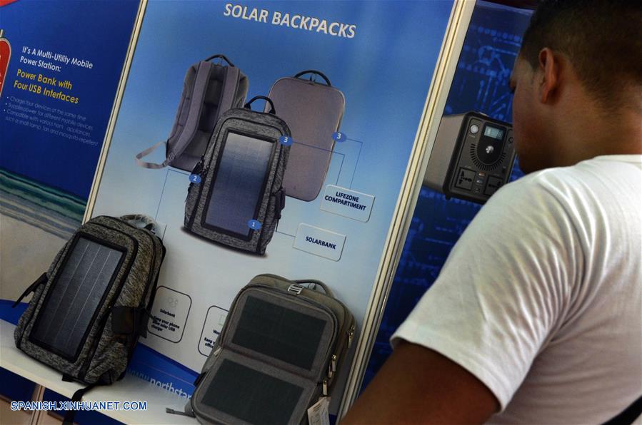 LA HABANA, noviembre 11, 2018 (Xinhua) -- Imagen del 2 de noviembre de 2018, de una persona observando mochilas equipadas con paneles solares flexibles que permiten cargar peque?os dispositivos portátiles, en el estand de la empresa china Beijing North Star, en el pabellón de China durante la 36 Feria Internacional de La Habana, en el recinto ferial de Expocuba, en La Habana, capital de Cuba. Cuba recibe un promedio de radiación solar de más de 1,800 kilowatts por metro cuadrado al a?o, lo que clasifica a la isla como una potencia energética a partir del uso de las fuentes renovables de energía (FRE), dicen los especialistas. Esa realidad es la que justifica la apuesta de la empresa china Beijing North Star por el mercado cubano, donde ahora se enfocan sobre todo en la comercialización de productos vinculados a las FRE. La empresa, que estuvo presente en la recién terminada 36 Feria Internacional de La Habana, mantiene una larga relación comercial con varias entidades gubernamentales cubanas, como los ministerios de Educación y de Salud Pública, a los que suministra productos que han tenido buena aceptación. (Xinhua/Joaquín Hernández)