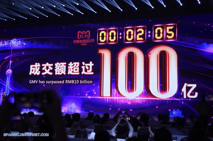 SHANGHAI, noviembre 11, 2018 (Xinhua) -- Una pantalla gigante muestra ventas en TMall, la plataforma de ventas en línea propiedad de Alibaba, para el pico de compras por el Día de los Solteros, en Shanghai, en el este de China, el 11 de noviembre de 2018. Las ventas por el Día de los Solteros de China en TMall llegaron a 10.000 millones de yuanes (unos 1.440 millones de dólares estadounidenses) en los primeros dos minutos y cinco segundos del domingo. El gigante de comercio electrónico lanzó la promoción anual de compras en línea el 11 de noviembre de 2009. (Xinhua/Huang Zongzhi)