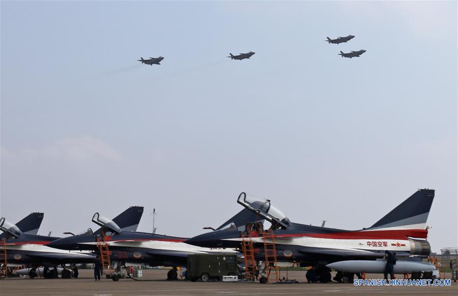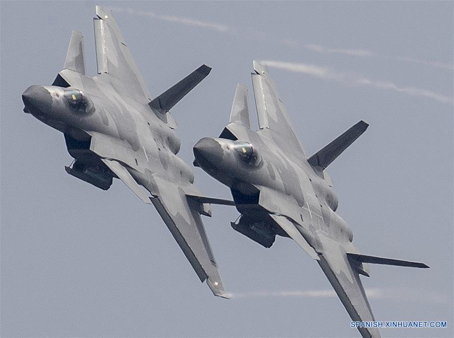 GUANGDONG, noviembre 11, 2018 (Xinhua) -- Aviones de combate J-20 participan durante la XII Exposición Internacional de Aviación y Aeroespacial de China (Airshow China), en Zhuhai, en la provincia de Guangdong, en el sur de China, el 11 de noviembre de 2018, conmemorando del 69 aniversario de la Fuerza Aérea del Ejército Popular de Liberación (EPL). (Xinhua/Liu Yinghua)