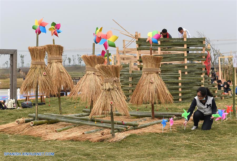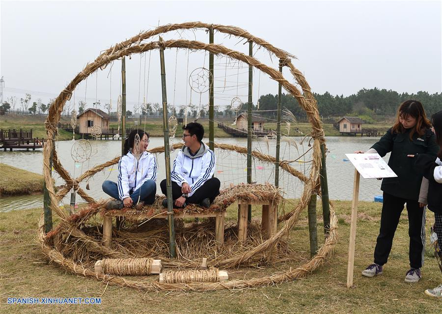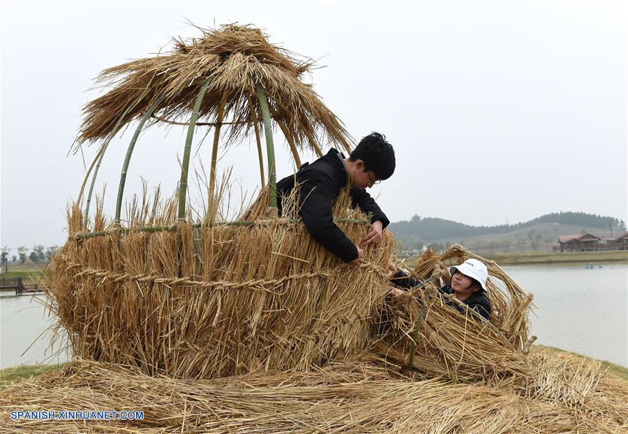 NANJING, noviembre 11, 2018 (Xinhua) -- Estudiantes de la Universidad Forestal de Nanjing, permanecen en una escultura de paja, durante un concurso de dise?o, en el parque agrícola Xitian, en Nanjing, capital de la provincia de Jiangsu, en el este de China, el 11 de noviembre de 2018. (Xinhua/Sun Can)